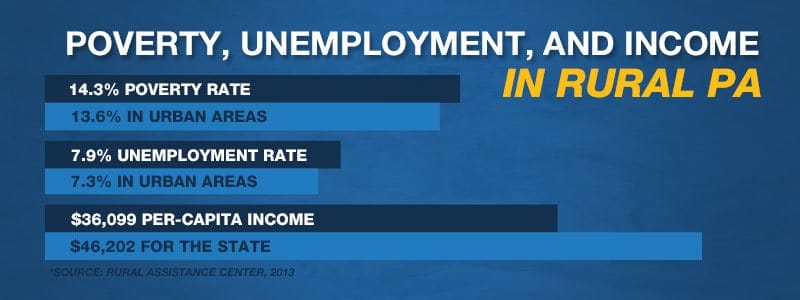 According to the Rural Assistance Center (RAC), rural communities in Pennsylvania lagged behind urban areas in poverty, unemployment and income for 2013: