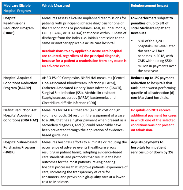 Pursuant to newly introduced regulations elaborated in the updated FY 2018 Medicare Inpatient Prospective Payment System (IPPS) Final rule, a variety of patient safety performance measures traverse several mandatory and/or voluntary value-based payment and reimbursement programs which individually, variably and collectively incentivize, penalize or withhold payments to acute care hospitals and health systems for numerous types of preventable adverse events and complications of care.